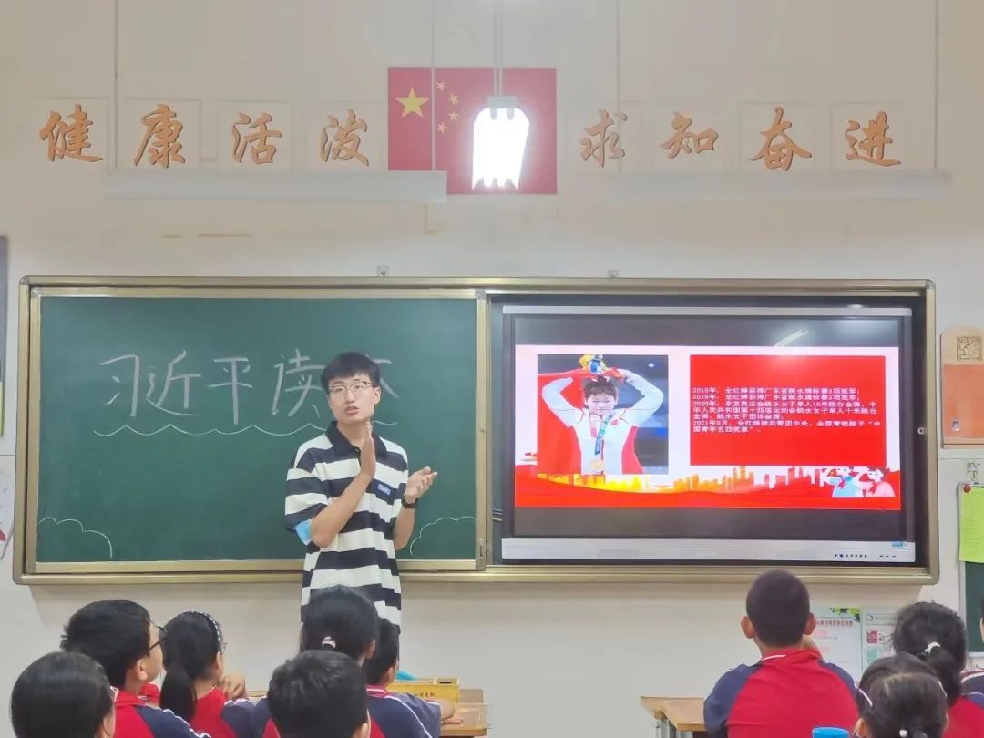 高翔通过介绍奥运冠军全红婵夺冠背后的故事,让同学们从自己的同龄人身上体会其优秀品质。在互动提问环节中,同学们从热爱祖国、孝敬父母、热心公益等多个方面谈及自己对如何做一名新时代好少年的看法,并表示在今后生活学习中会心有榜样、从小做起,争做一名优秀的少先队员。