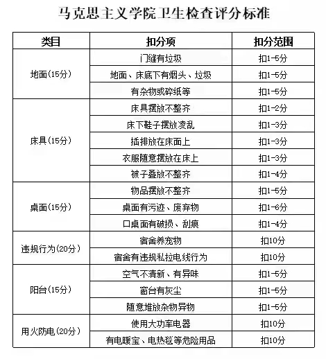 3月13日下午,我院开展宿舍安全卫生检查工作,检查标准如下: