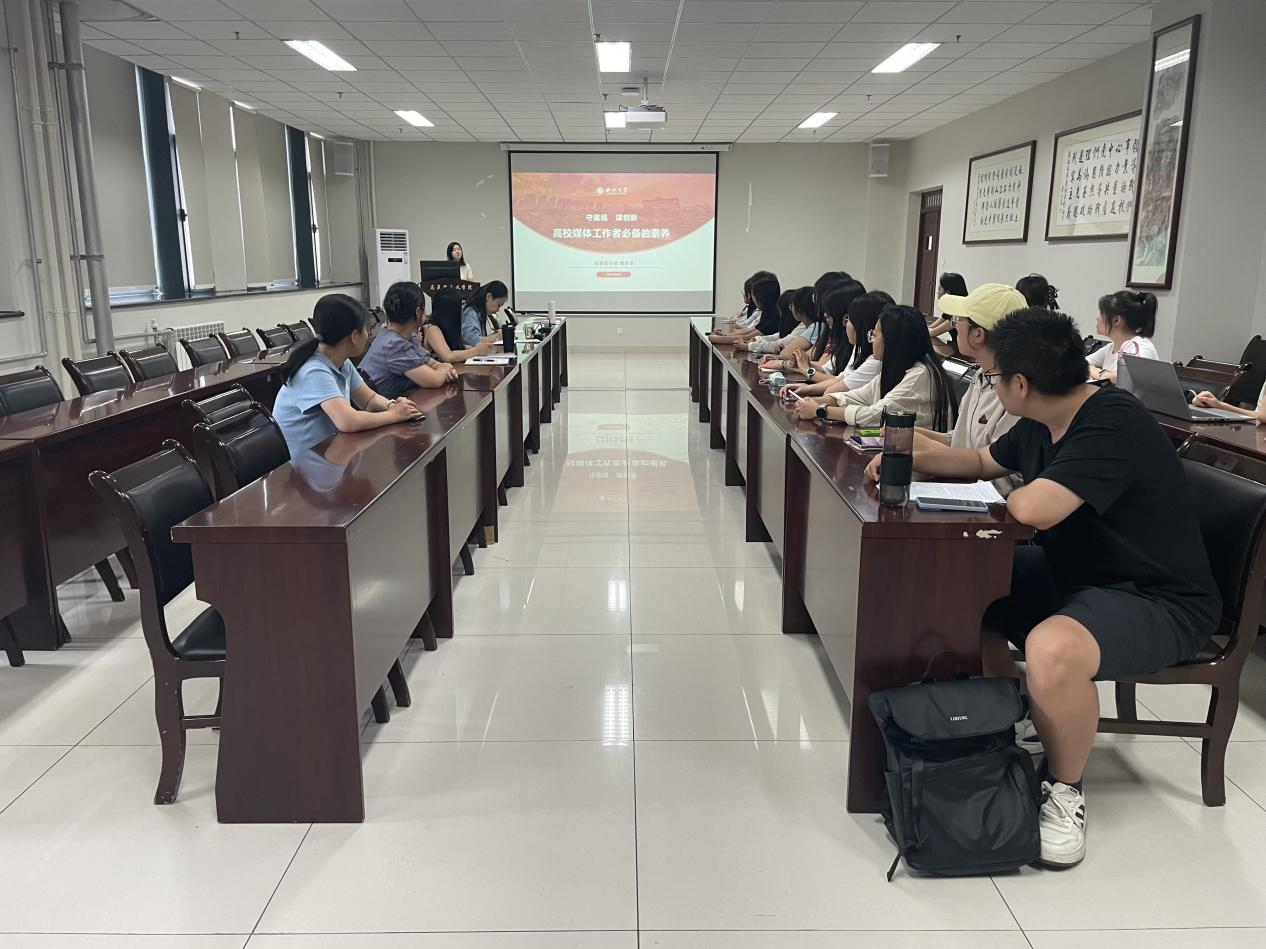 首先,校党委宣传部新媒体中心负责同志作了题为《守底线 谋创新——高校媒体工作者必备的素养》专题报告。她带领与会师生深入学习了习近平文化思想和习近平总书记关于媒体工作的重要论述,强调宣传思想文化工作的重要意义。随后,她详细讲解了新闻稿件的内容组成要素,对学校新闻宣传的有关规定和要求进行了系统梳理,并从“知晓”“认同”“行动”三个层次阐释了高校媒体工作者应当具备的基本素养。